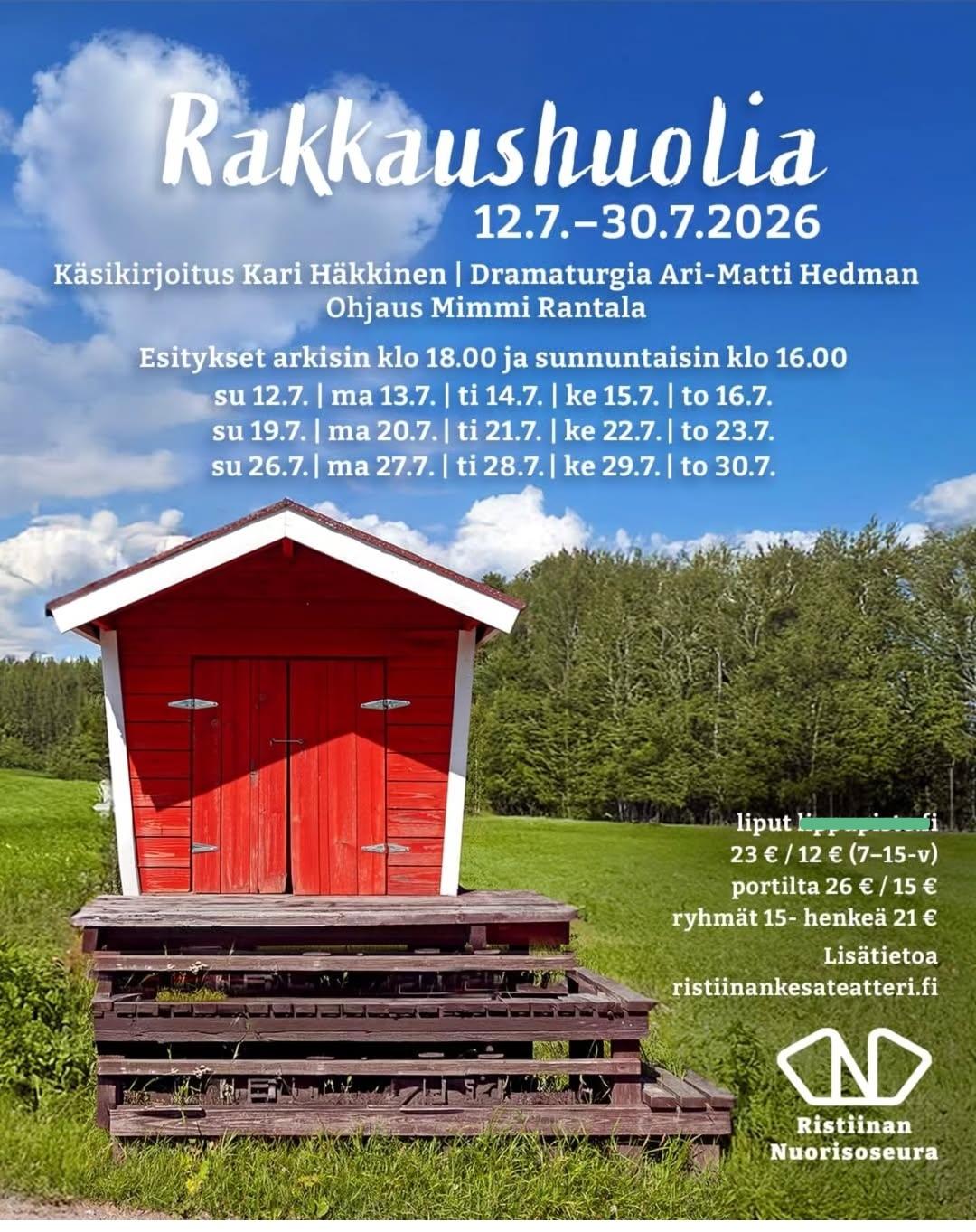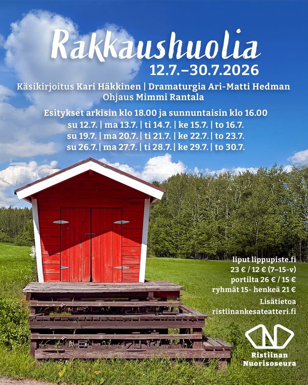12.-30.7.2026 arkisin maanantaista torstaihin kello 18.00 ja sunnuntaisin kello 16.00.